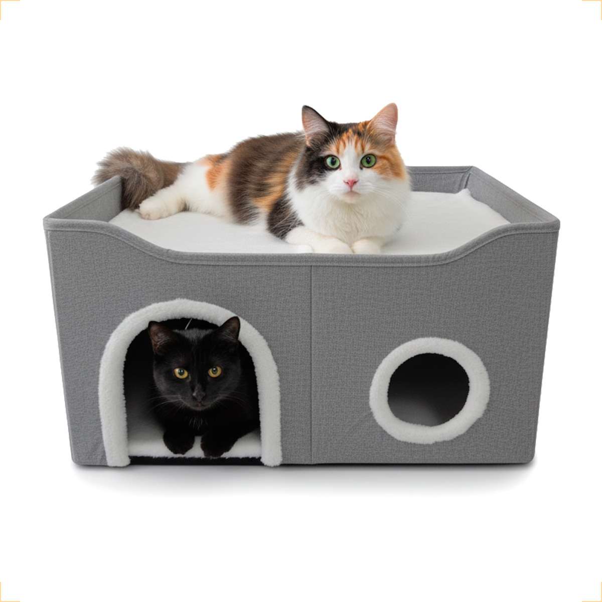 A Casinha de Gato Deluxe com Arranhador é perfeita para gatos que adoram se esconder, descansar e observar o ambiente. Com dois níveis incluindo um andar superior ideal para vigilância — e um arranhador lateral em sisal, ela combina conforto, funcionalidade e um toque de luxo. Totalmente desmontável, leve e prática, é ideal para ambientes internos como casas e apartamentos.