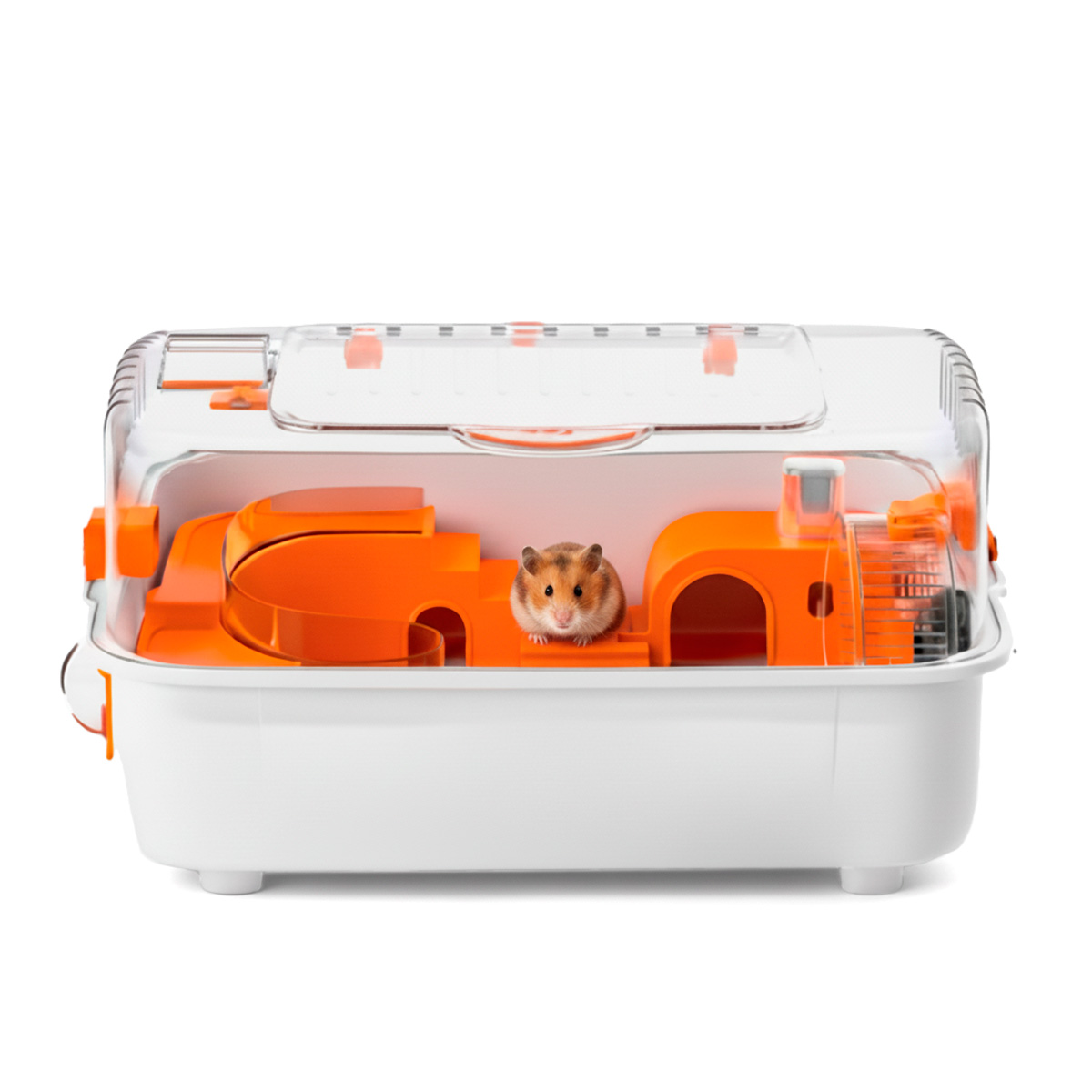 A gaiola possui a parte de cima transparente, o que permite que você veja seus animais de estimação brincando em um ambiente projetado para simular condicionais naturais de 360 ângulos. Ideal para ser conectado a habitats modulares.